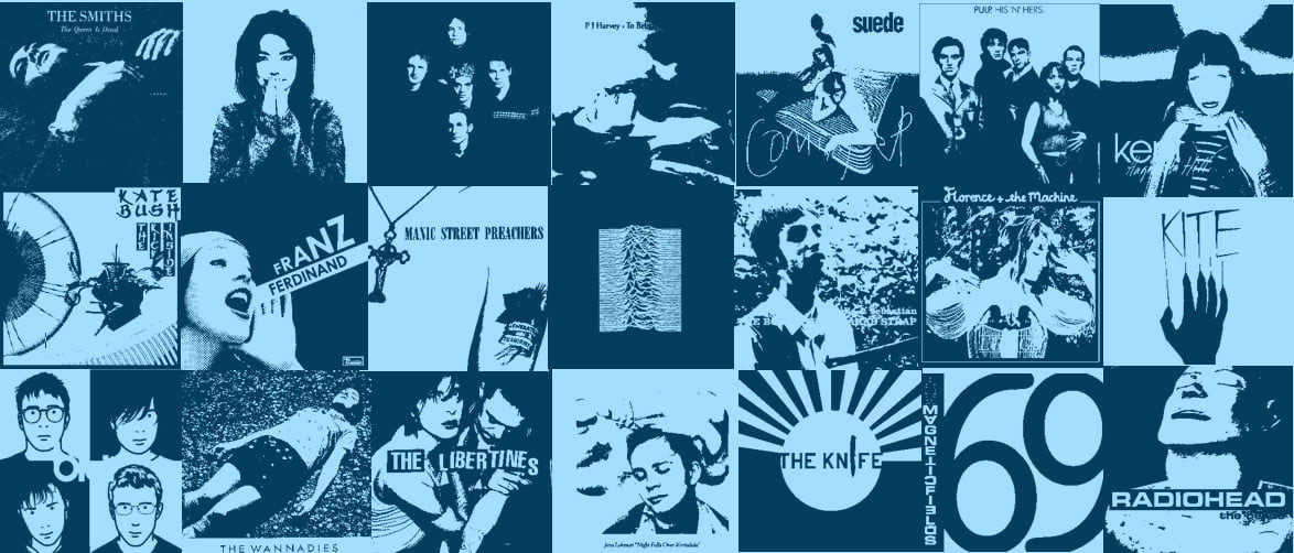 The Smiths, PJ Harvey, Depeche Mode, Kent, Joy Division, Florence + The Machine, Le Tigre, Jens Lekman, The Libertines, The Wannadies, Placebo, Glasvegas, Franz Ferdinand, Sparks, Susanne Sundfør, The Knife, The Stone Roses, Nicole Sabouné, Radiohead, Makthaverskan, Molly Nilsson, Morrissey, The Cure, New Order, Grimes, Anna Ternheim, The White Stripes, Belle & Sebastian, The Killers, Frida Hyvönen, Pulp, Thåström, La Roux, Echo & The Bunnymen, Hurula, Björk, The Cardigans, Broder Daniel, Amason, The Clash, The Strokes, Sara Parkman, Interpol, Austra, Manic Street Preachers, Blur, Cocteau Twins, Oasis, El Perro Del Mar, Suede, The Smashing Pumpkins, Future Islands, Terra, The Magnetic Fields, Ladytron, Chvrches, Lykke Li, Siouxsie & The Banshees och mycket mer!